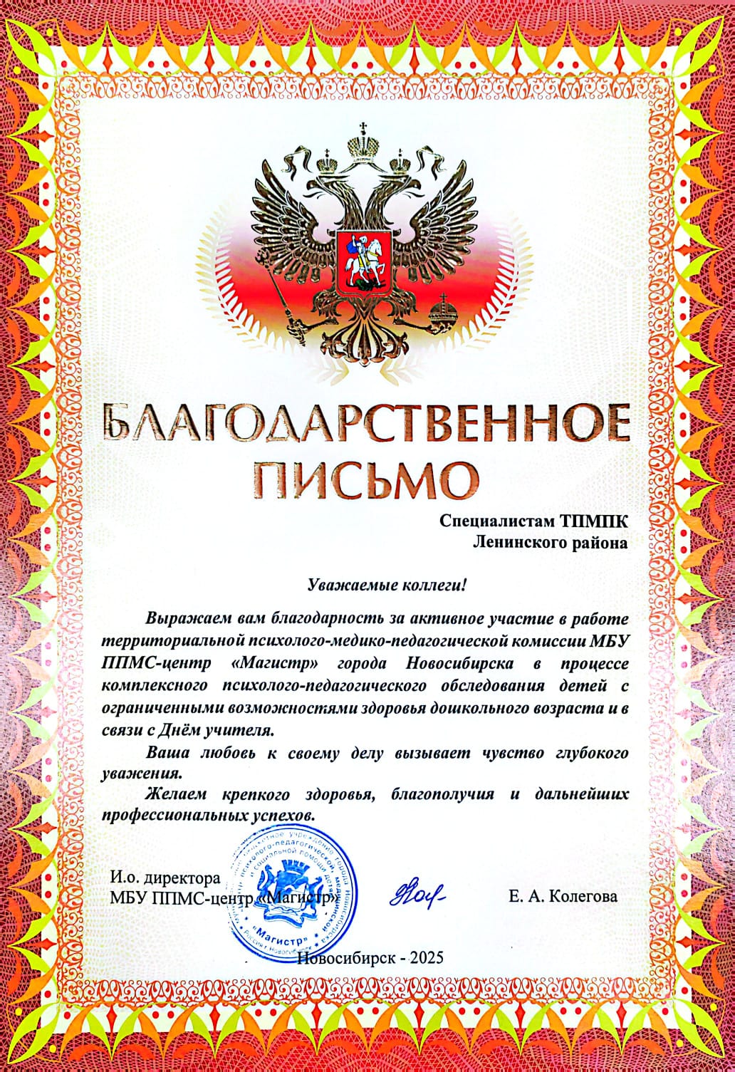 Благодарственное письмо за активное участие в работе территориальной психолого-медико-педагогической комиссии г. Новосибирска в процессе комплексного психолого-педагогического обследования детей с ограниченными возможностями здоровья дошкольного возраста.